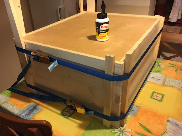 Előszőr az előlap és hátlap rögzítő léceket ragasztottam az oldalakra, csavarokkal megerősítve, majd az oldalakat ragasztottam egymáshoz. A derékszög tartásához a már leszabott előlapot tettem a helyére a ragasztás idejére. Ezért kellett a tartóléceket előre beragasztani. A racsnis heveder sarkonként 2-2 léccel megsegítve tökéletes megoldás volt az élek összehúzására.